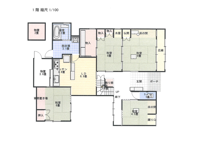 1階LD6.9畳 1階K3.8畳 1階和室8畳 1階和室6畳 1階和室6畳 1階和室4.5畳 2階洋室11.2畳 2階洋室5.7畳 2階S3畳 |