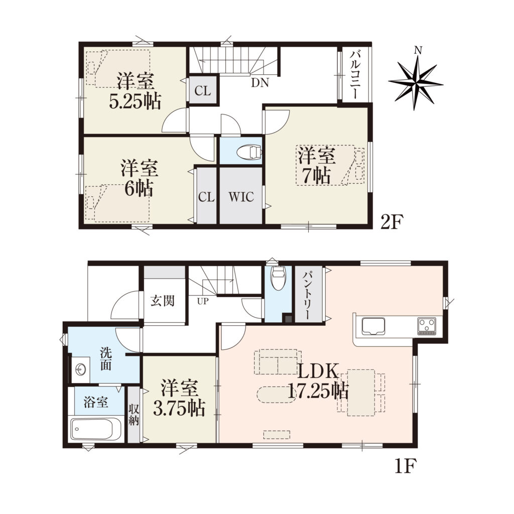 1階LDK17.25畳 1階洋室3.75畳 2階洋室7畳 2階洋室6畳 2階洋室5.25畳 2階S |