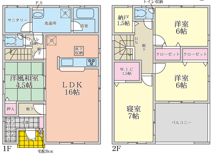 1階LDK16畳 1階和室4.5畳 2階洋室7畳 2階洋室6畳 2階洋室6畳 2階S1.5畳 2階S1.5畳 |